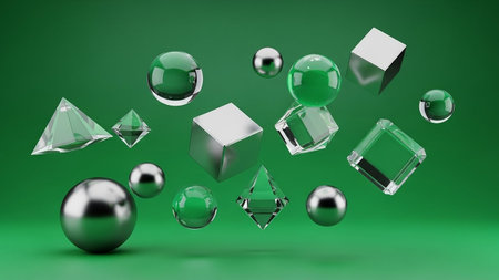 3d rendering of abstract geometric shapes in green color background. Computer digital drawing.