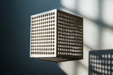 A modern perforated cube with circular cutouts, suspended and casting intricate shadow patterns, showing abstract and minimalist design.