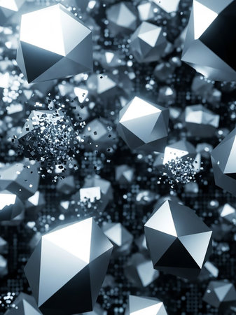 A dark, abstract composition featuring a cluster of luminous 3D geometric icosahedrons and scattered debris, with a subtle digital grid pattern in the background.