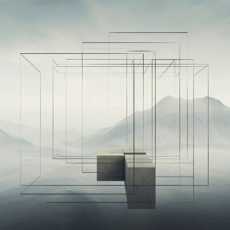 Abstract geometric composition of transparent cubes suspended in a futuristic, ethereal environment with a glowing light source below