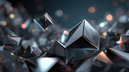 The image features several transparent, crystal-like pyramids suspended against a dark, nebulous backdrop. The lighting highlights their facets, creating a play of light and shadow, with subtle warm tones. This artistic composition might be suitable for abstract design projects, or conceptual illustrations in various media.
