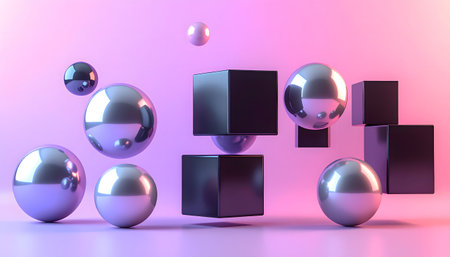 Minimalist modern digital art of chrome spheres and dark cubes suspended in a gradient pink and purple space, casting subtle shadows