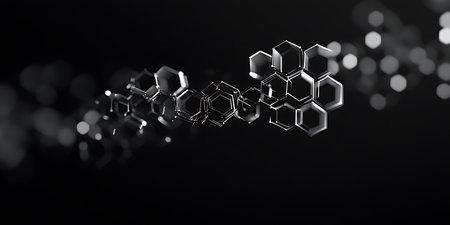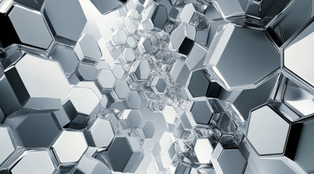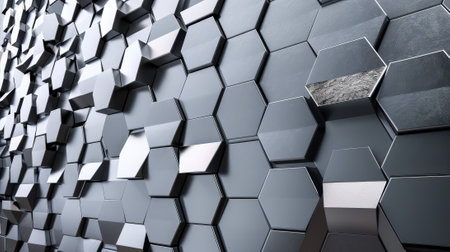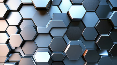 A stunning 3D rendered image showcasing an abstract arrangement of metallic hexagons on a dark surface, emphasizing modern design aesthetics.