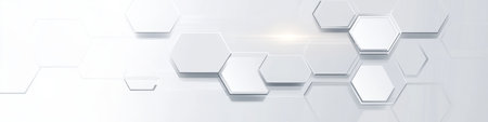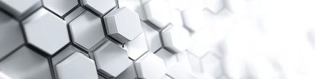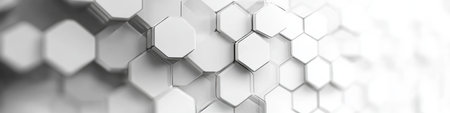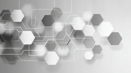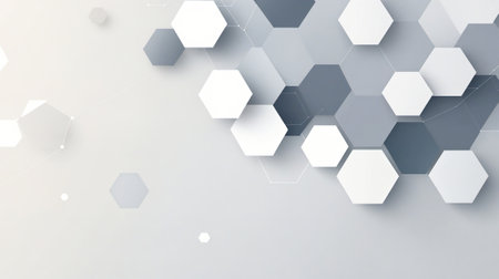 Abstract hexagon geometry background in shades of gray and white. The hexagons have a smooth, matte finish, with subtle shadows and highlights. The design is minimalist and modern, perfect for a clean and sleek look.