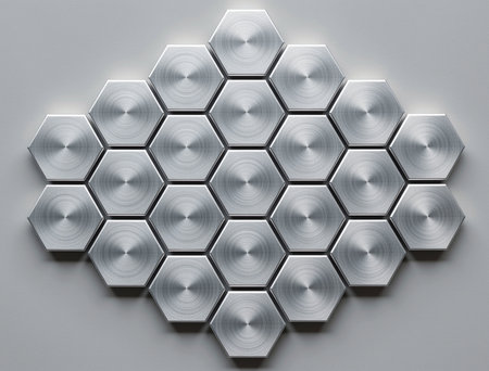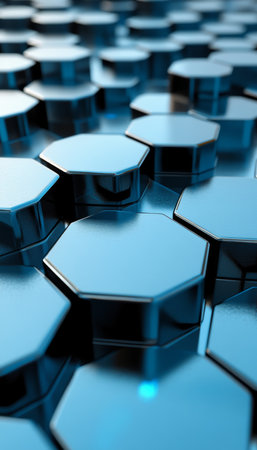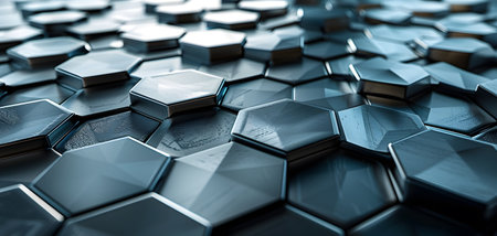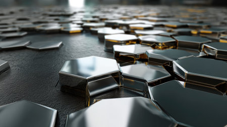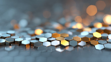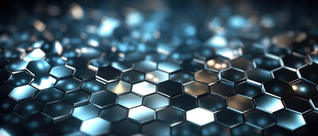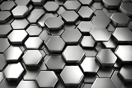 A close-up view of shiny metallic hexagons creating a visually appealing pattern. Ideal for technology and modern design projects, this image conveys elegance and depth.
