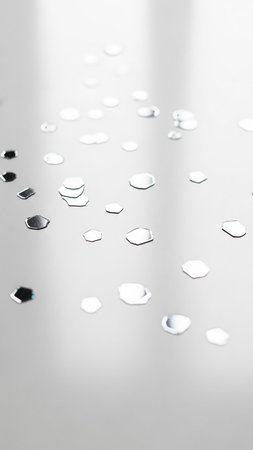Scattered showing scattered small hexagonal silver metallic confetti pieces with sharp edges lying on a smooth reflective bright white surface with soft shadows...