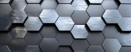 A futuristic metal surface with a repeating pattern of hexagonal tiles, each with a different shade of metallic sheen and glowing blue accents, creating a high-tech feel.