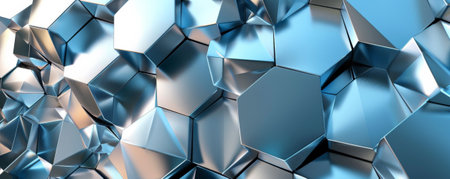 Abstract geometric background showcasing overlapping hexagons and triangles in metallic silver and blue. The sleek design and reflective surfaces give a futuristic and high-tech feel.