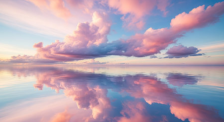 A stunning view of soft pink and white clouds drifting in a clear blue sky, creating a serene atmosphere above a tranquil horizon. Perfect for landscape lovers.