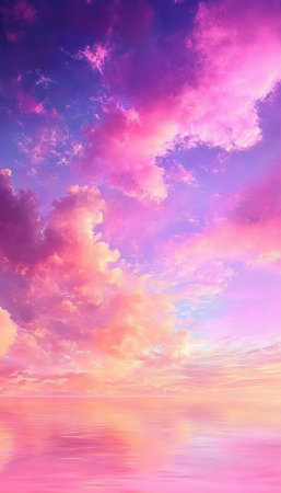 A serene sunset sky with a gradient of purple, pink, orange, and yellow hues, with wispy clouds above a calm ocean...