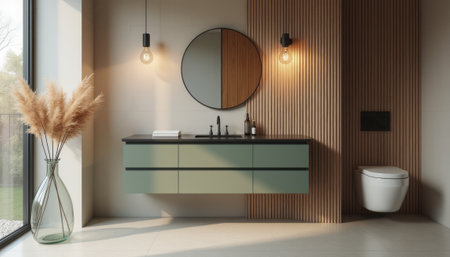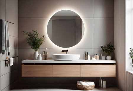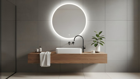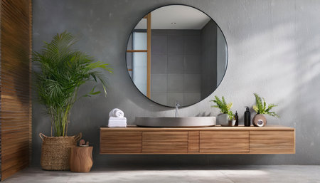 This contemporary bathroom features a sleek vanity with a dark countertop, complemented by a round mirror and stylish lighting. The warm wood accents and soft greenery create a serene atmosphere, perfect for relaxation.