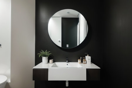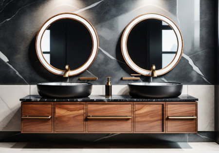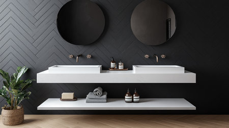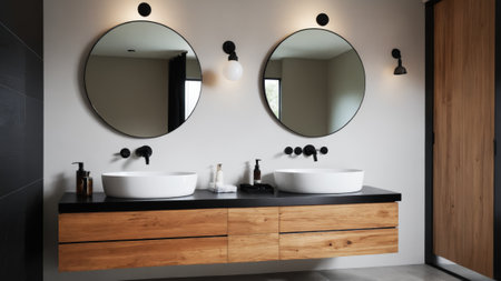 This modern bathroom interior features two round mirrors above a dark vanity with two sinks. The design incorporates a minimalist approach with clean lines, neutral colors, and ambient lighting. The composition suggests a sense of order and space, suitable for various design projects and commercial applications.