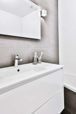 Elegant bathroom washbasin with stylish silver taps, big mirror in frame and decorative chest of drawers