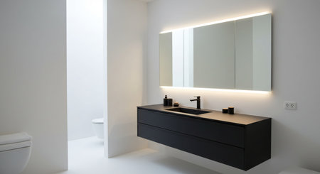 A bathroom with a sink and mirror showing minimalist bathroom with floating black vanity, frameless mirror, and soft led