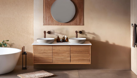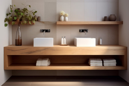 Elegant wooden bathroom vanity featuring two white sinks and minimalist decor in a stylish interior