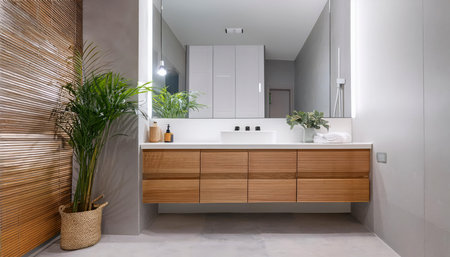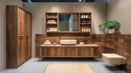 Discover a stunning modern bathroom featuring sleek wooden cabinetry, minimalist fixtures, natural decor accents, and serene lighting, perfect for relaxation and comfort.