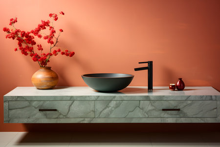 Interior of modern bathroom with green and red walls, concrete floor, green sink and black vase with dried flowers. ai generated