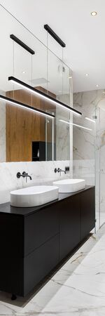 Vertical panorama of elegant bathroom with black chest of drawers under two washbasins and led lights