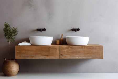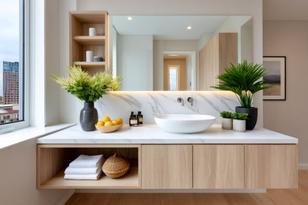 AI Generated. Modern bathroom design featuring a sleek wash basin and a touch of greenery