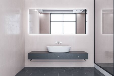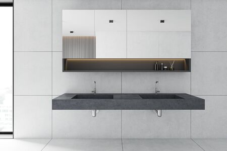 Interior of stylish spacious bathroom with white tiled walls and floor, comfortable stone double sink and cabinet with mirrors above it. 3d rendering