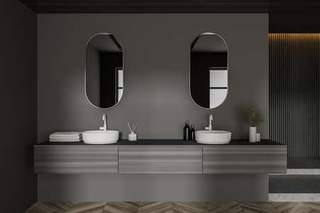 Close up of spacious bathroom with gray and wooden walls, wooden floor and double sink with oval mirrors. 3d rendering