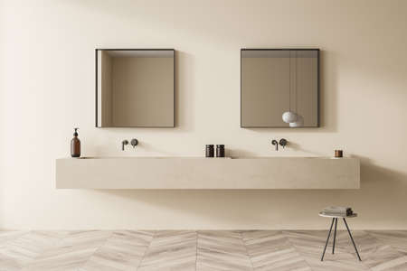 Bathroom interior with beige walls and parquet tiles. Two square mirrors over shelf vanity with sinks and taps and minimalist stool. Concept of modern design. 3d rendering