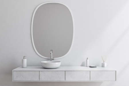 Interior of modern bathroom with white walls, comfortable white sink with round mirror above it and wooden drawers. 3d rendering