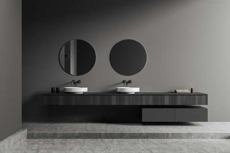 Dark bathroom interior with double sink and two round mirror, podium and gray concrete floor. Wooden dresser with bathing accessories, towel and reed diffuser. 3D rendering