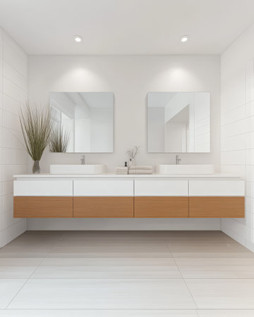 Discover a stunning modern bathroom featuring dual sinks, elegant mirrors, minimalist decor, and natural accents, perfect for a serene home environment.