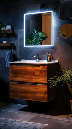 This image showcases an elegant modern bathroom featuring an illuminated mirror, wooden vanity, and lush greenery, perfect for contemporary home decor inspiration.