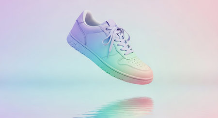 A single athletic sneaker is captured in a minimalist studio environment, appearing to float against a softly lit background with subtle pastel color shifts. The shoe a gentle gradient of pastel colors, including pink, purple, and light blue, across its leather-like surface. White laces and a white sole are present. A clear reflection of the shoe is visible on the smooth, glossy surface below, contributing to the clean and aesthetic. The focus is on the shoe's form and its delicate color...