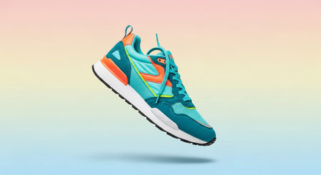 a stylish athletic shoe in shades of teal and orange, accented with white and a touch of lime green. The shoe has a white sole and is shown floating against a soft, pastel gradient background that transitions from pink to yellow and blue. The detailed construction of the shoe, including its mesh panels and lacing, is clearly visible. The composition is clean and modern, emphasizing the shoe's and color scheme.