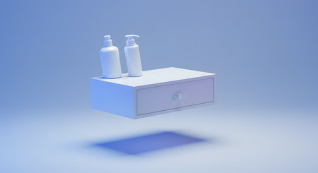 White bottles on a minimalist floating nightstand against a light blue background.