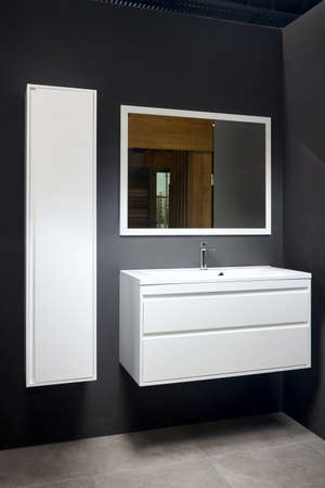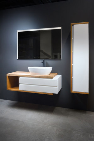 Stoneware countertop bathroom with dark tired beton wall stoneware tiled floor. White industrial flat loft bathroom with modern countertop basin, square mirror and wooden PVC cupboard.
