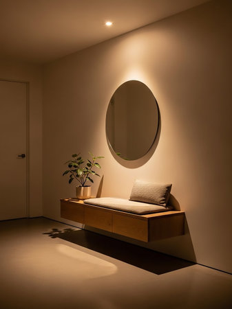A cozy entryway nook with a floating wooden bench, a round mirror on the wall, and warm ambient lighting casting shadows.