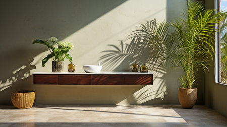 The bathroom vanity and area are modern and minimalistic, with a brown matte cement wall featuring a leafy shadow and a green tropical bamboo palm tree that catches the sunshine.