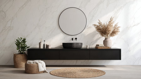 This modern bathroom showcases a sleek black vanity with a round mirror, marble wall, and beautiful plant, creating a serene and stylish space for relaxation and grooming.