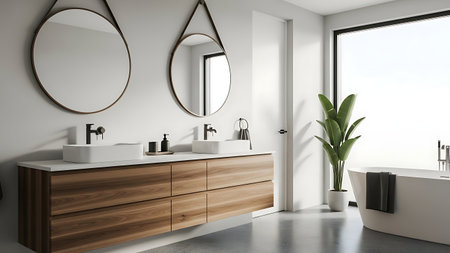Modern bathroom with double vanity, mirrors, bathtub, and plant, bright interior design