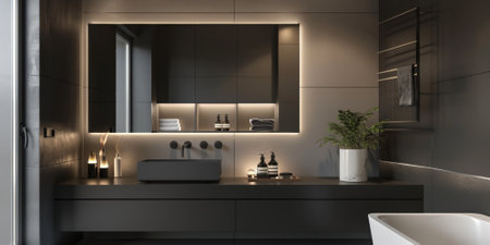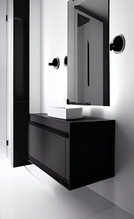Sophisticated modern bathroom with a monochrome palette. Black and white tiles, black fixtures, and a floating vanity. Geometric decor, large mirror, and soft lighting.