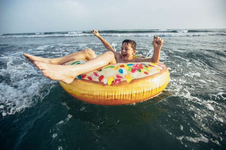 Joyful child on inflatable ring ride on breaking wave. Travel lifestyle, swimming activities. Selective focus