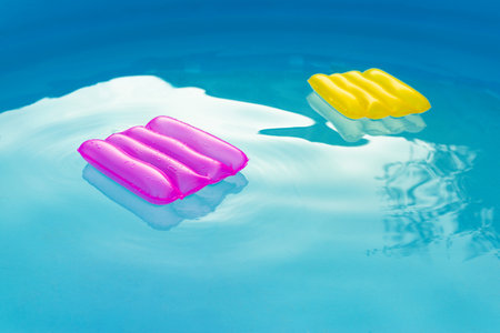 Two inflatable pillows, yellow and purple, lie on the surface of the water. beach accessories.