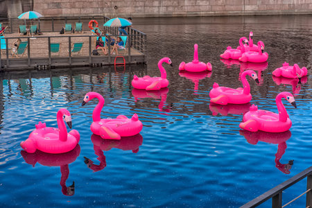 St. Petersburg, RUSSIA 17,06,2018 Pink inflatable flamingos in the New Holland Park
