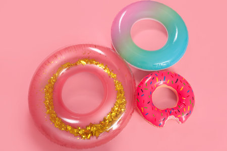Rubber ring floating, beach accessories for swimming. Tour and summer vacation booking. Concept of relax and lounge. Mockup copy space, 3D rendering