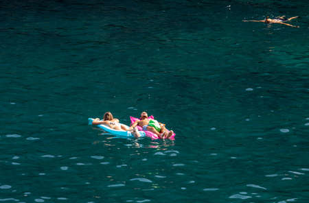 A company of young people on the air mattresses in the sea in Binodorm Spain