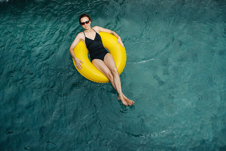 Beautiful young asian woman with yellow inflatable ring relaxing in swimming pool. top view