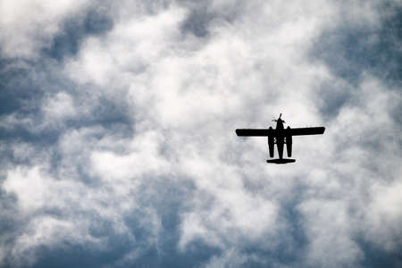 Downtown Vancouver, British Columbia, Canada - September 21, 2019: Floatplane in Vancouver Harbour during a cloudy evening.