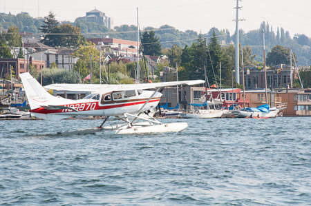 Seattle, WA USA August 23, 2014: Lake Union in Seattle bustles with life. Popular for pontoon planes landing and taking off, with houseboats in the background against the city's background.