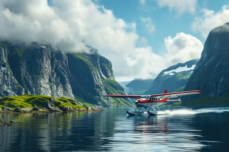 a red plane rests peacefully on the water, capturing the essence of hazy romanticism. this photograph showcases detailed portraitures with a touch of farm security administration aesthetics. shot in 32k uhd using a leica cl, the image is bathed in a soft palette of light gray and amber. the use of high-speed sync adds a dynamic element to the composition. ai generated