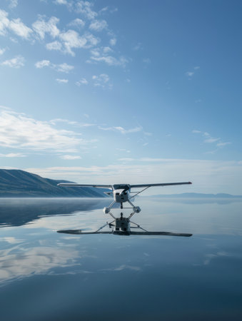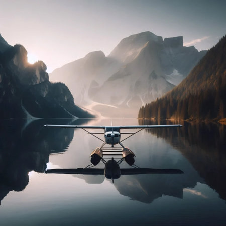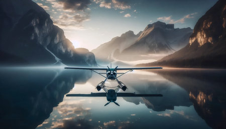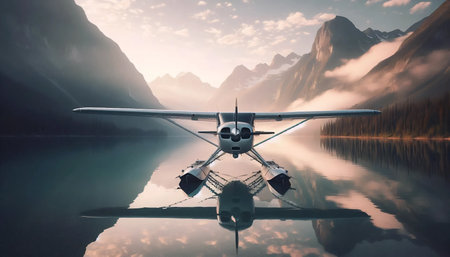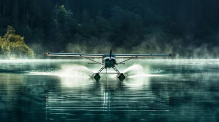 A seaplane gracefully touching down on the surface of a tranquil lake, its water skis creating ripples as it glides to a gentle stop, blending adventure with serenity.