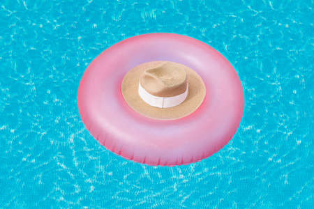 A pink rubber ring on which lies a straw hat floats on the surface of the water with highlights in the pool. Vacation concept, background, summer
